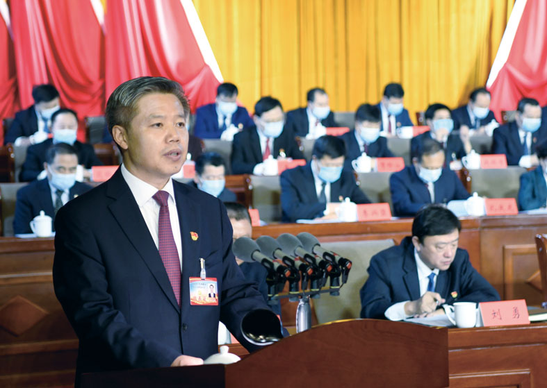 董晓宇代表中共承德市第十四届委员会向大会作报告。本网记者 陈琦嘉 王立群 摄